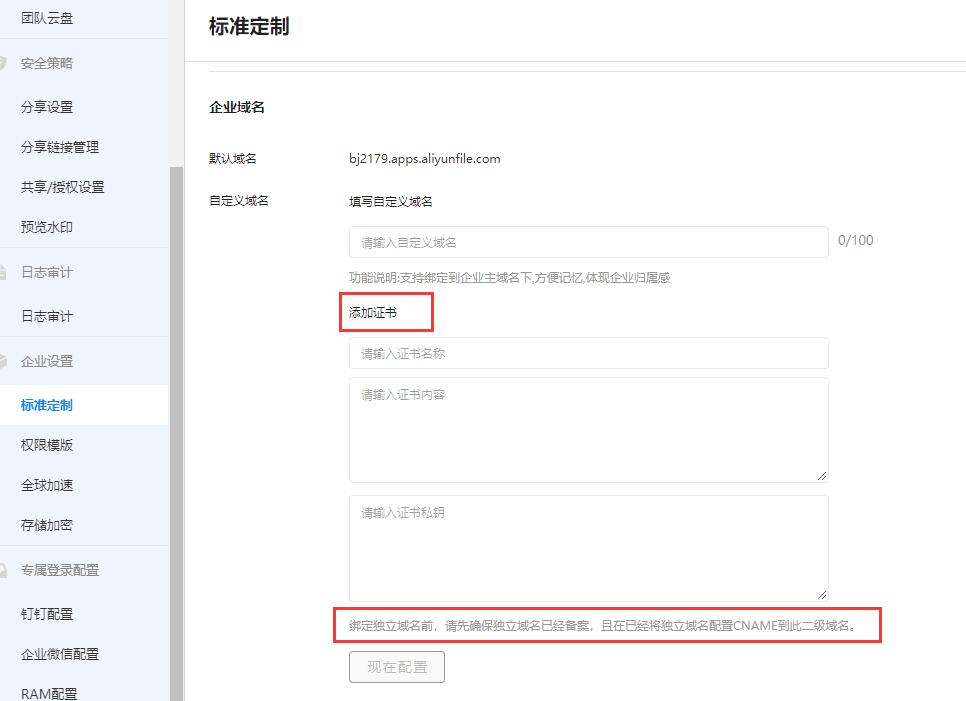 企业网盘的分享链接可以使用自己的域名吗?可以的,阿里云企业网盘分享支持自定义域名配置,自定义的域名需要有阿里云备案、需要有https证书。