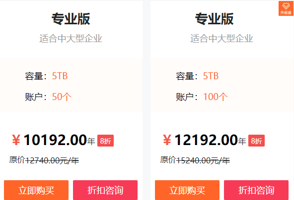 阿里云企业网盘怎么收费?阿里云企业网盘提供了四个不同版本,包括小微版、小微版(升级版);标准版、标准版(升级版);专业版、专业版(升级版),集团版、集团版(升级版)。每个版本容量不通过,账户数量不同,收费自然就不同。