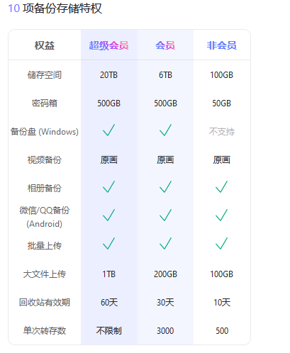 超级会员:20GB容量;198元/年(618限时2.8折)超额容量:5TB;388元/年