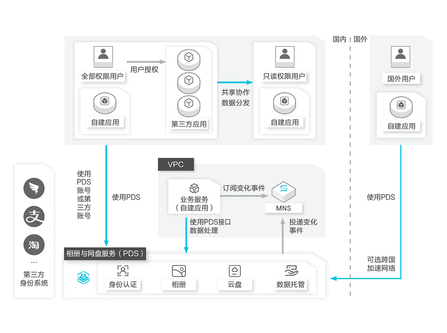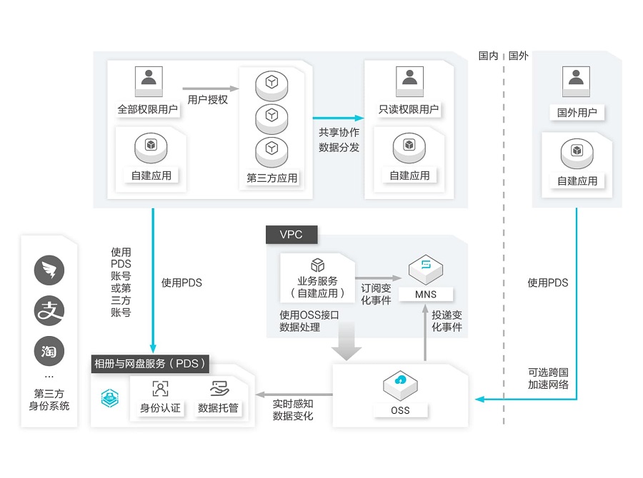 PDS提供了目录、文件管理,影像内容进行分类打标、人脸识别等智能分析、基于内容的智能搜索能力,以及用户体系和第三方身份系统接入的能力,您可基于此开发一套面向企业或个人的网盘、相册系统。同时PDS提供了一些官方应用,可和你的系统组合使用,简化您的开发。数据托管场景