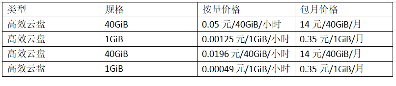 高效云盘   40GiB    0.05元/40GiB/小时      14元/40GiB/月