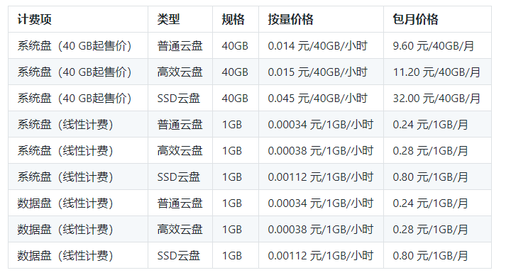 系统盘(线性计费)SSD云盘  1GB   0.00112元/1GB/小时  0.80元/1GB/月