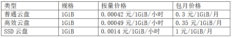 普通云盘 :1 GiB 0.00042 元/1 GiB/小时 0.3 元/1 GiB/月SSD云盘 :1 GiB 0.0014 元/1 GiB/小时 1 元/1 GiB/月