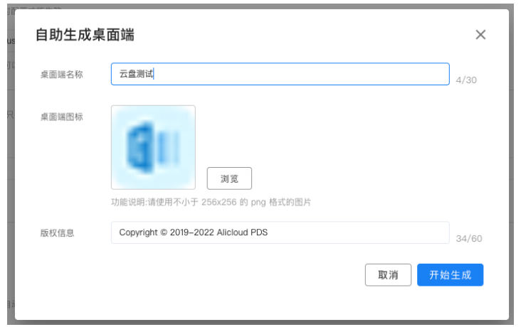 2、输入桌面端名称,选择桌面端图标,填写版权信息,点击开始生成即可开始。