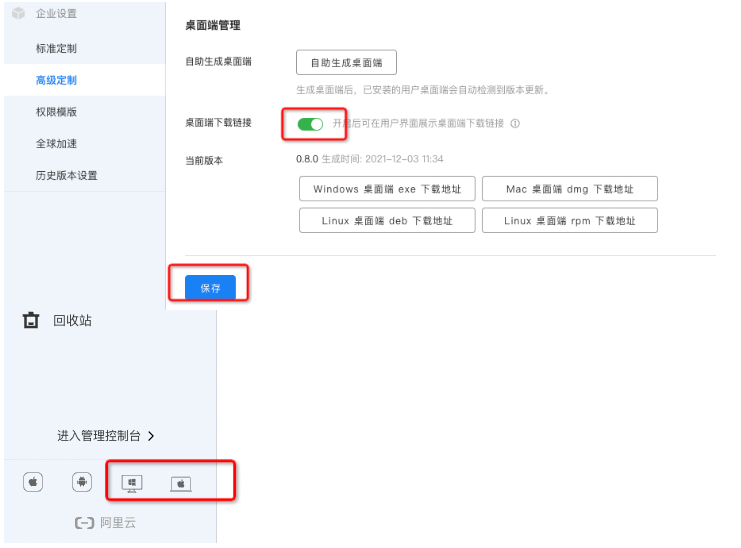 4、打开下载链接开关,点击保存,用户就可以在用户界面上下载桌面端了。